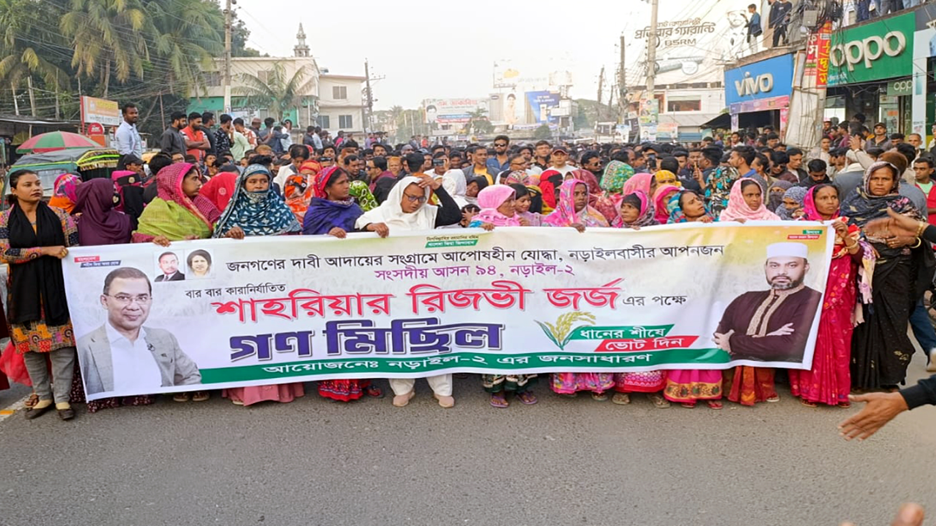 নড়াইল-২ আসনে ধানের শীষে মনোনয়ন দাবিতে জেলা বিএনপির সাবেক সাংগঠনিক সম্পাদক কেন্দ্রীয় ছাত্রদলের সাবেক সহ-সাধারণ সম্পাদক শাহরিয়ার রিজভী জর্জের পক্ষে বিশাল গণমিছিল অনুষ্ঠিত হয়েছে। বৃহস্পতিবার (২৭ নভেম্বর) বিকেলে নড়াইল শহরের পুরাতন বাসটার্মিনাল চত্বর থেকে গণমিছিল বের হয়ে রূপগঞ্জ এলাকা প্রদক্ষিণ করে। এর আগে পথসভায় বক্তব্য দেন- বিএনপির মনোনয়ন প্রত্যাশী শাহরিয়ার রিজভী জর্জ।