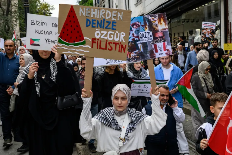 এদিন, তুরস্কের ইস্তাম্বুলে হাজারো মানুষ হায়া সোফিয়া মসজিদ থেকে গোল্ডেন হর্ন নদীর তীরে মিছিল করে, যেখানে তুর্কি ও ফিলিস্তিনি পতাকায় সাজানো নৌকা তাদের অপেক্ষায় ছিল।