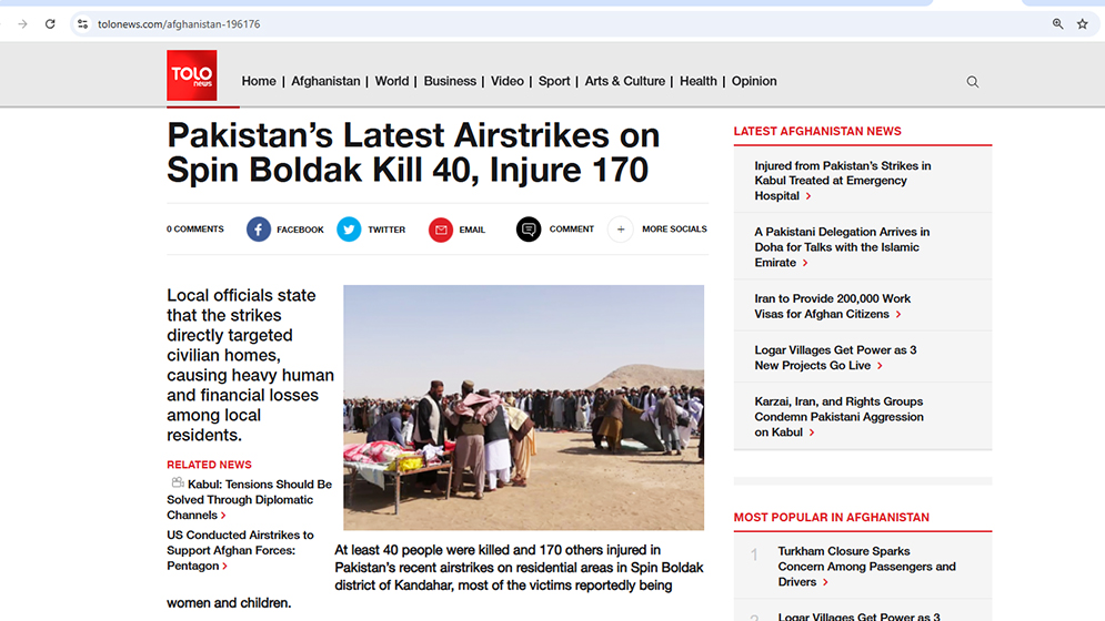 আফগানিস্তানের কান্দাহার প্রদেশের স্পিন বোলদাক শহরে হামলা চালিয়েছে পাকিস্তানের বিমান বাহিনী। এতে নিহত হয়েছেন ৪০ জন এবং আহত হয়েছেন আরও অন্তত ১৭০ জন।