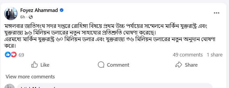পোস্টে তিনি লেখেন, মঙ্গলবার জাতিসংঘ সদর দপ্তরে রোহিঙ্গা বিষয়ে প্রথম উচ্চ পর্যায়ের সম্মেলনে মার্কিন যুক্তরাষ্ট্র ও যুক্তরাজ্য ৯৬ মিলিয়ন ডলারের নতুন সাহায্যের প্রতিশ্রুতি ঘোষণা করেছে। এর মধ্যে যুক্তরাষ্ট্র ৬০ মিলিয়ন ডলার এবং যুক্তরাজ্য ৩৬ মিলিয়ন ডলার অনুদান ঘোষণা করে।
