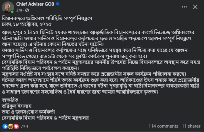 বিজ্ঞপ্তিতে বলা হয়, শনিবার দুপুর ২টা ১৫মিনিটে বিমানবন্দরের কার্গো ভিলেজে অগ্নিকাণ্ডের ঘটনা ঘটে। ফায়ার সার্ভিস ও বিমানবন্দর কর্তৃপক্ষের দ্রুত ও সমন্বিত পদক্ষেপে আগুন সম্পূর্ণ নিয়ন্ত্রণে আনা হয়েছে। এ ঘটনায় কেউ প্রাণ হারায়নি বলেও নিশ্চিত করেছে মন্ত্রণালয়।