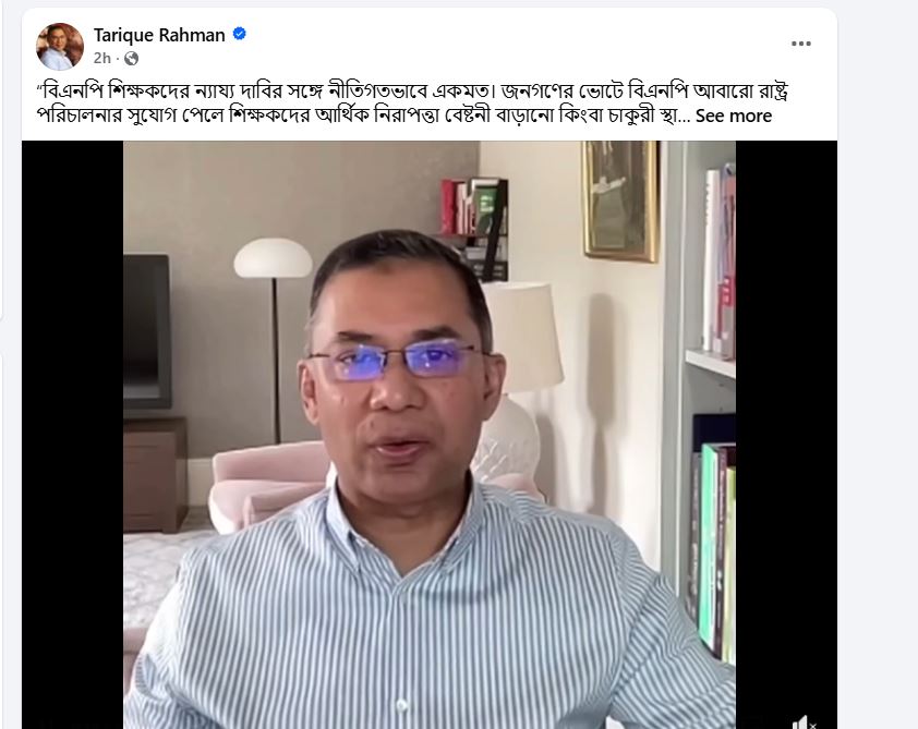 বিএনপির ভারপ্রাপ্ত চেয়ারম্যান তারেক রহমান বলেছেন, বিএনপি শিক্ষকদের ন্যায্য দাবির সঙ্গে নীতিগতভাবে একমত। জনগণের ভোটে বিএনপি আবারও রাষ্ট্র পরিচালনার সুযোগ পেলে শিক্ষকদের আর্থিক নিরাপত্তা বেষ্টনী বাড়ানো কিংবা চাকরি স্থায়ীকরণের জন্য উচ্চ পর্যায়ের কমিশন গঠন করবে।